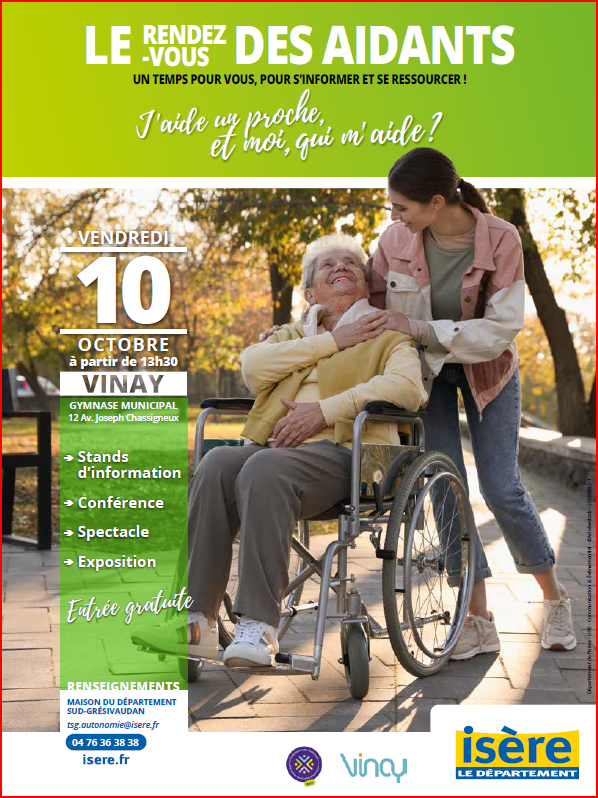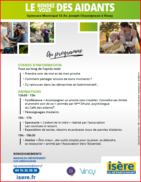 Venez nous rejoindre le vendredi 10 octobre, de 13h30 à 18h30, au gymnase municipal de Vinay pour « le rendez-vous des Aidants », organisé par le Département de l’Isère.
